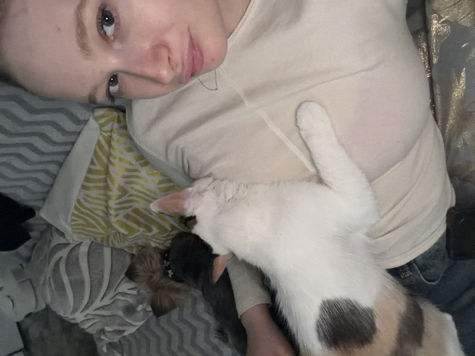 - "An indoor scene in Rossiyskiy, Russia, depicts a light-skinned female individual, a calico cat, and a small dog resting among pillows" by FM-t12ef2, licensed under CC BY 4.0