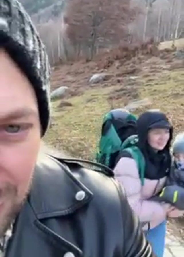 family hiking in a mountainous area with sparse trees. The camera is held by a man wearing a black leather jacket and a knit hat. Behind him, a woman is carrying a green child carrier backpack with a baby in her arms. The woman is wearing a hooded jacket. The environment is dry and covered in fallen leaves, with a paved path visible. The weather appears cold. The baby is crying.