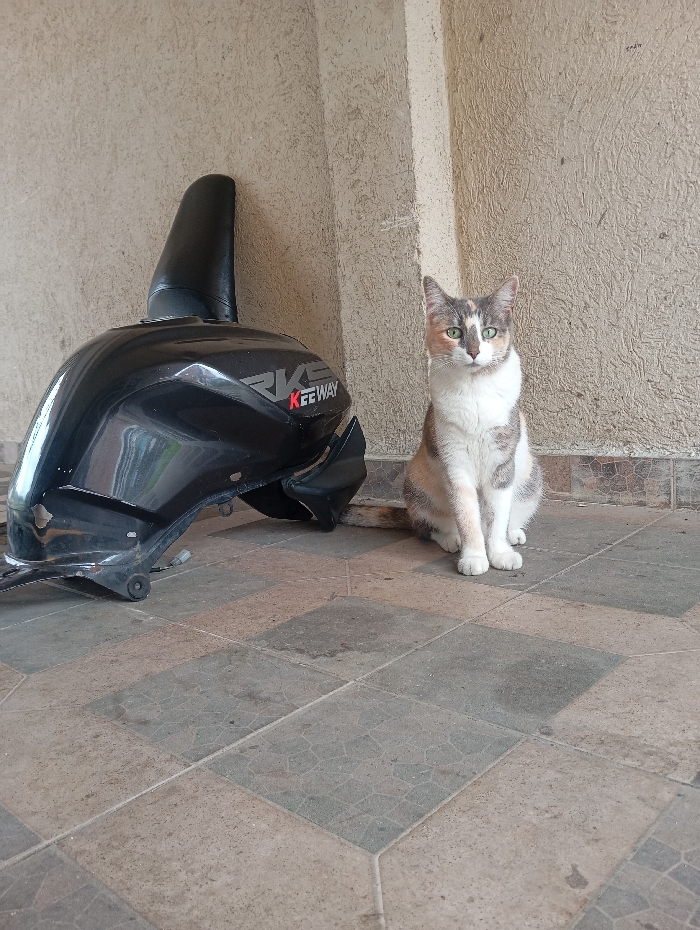 A gray, white, and brown cat with green eyes sits upright on a tiled floor, its paws neatly placed. To its left, a black motorcycle gas tank with a seat attached rests on the floor. The gas tank displays the word "KEEWAY" in white letters with a red accent. The background consists of a textured, neutral-colored wall. The scene is illuminated by natural light.