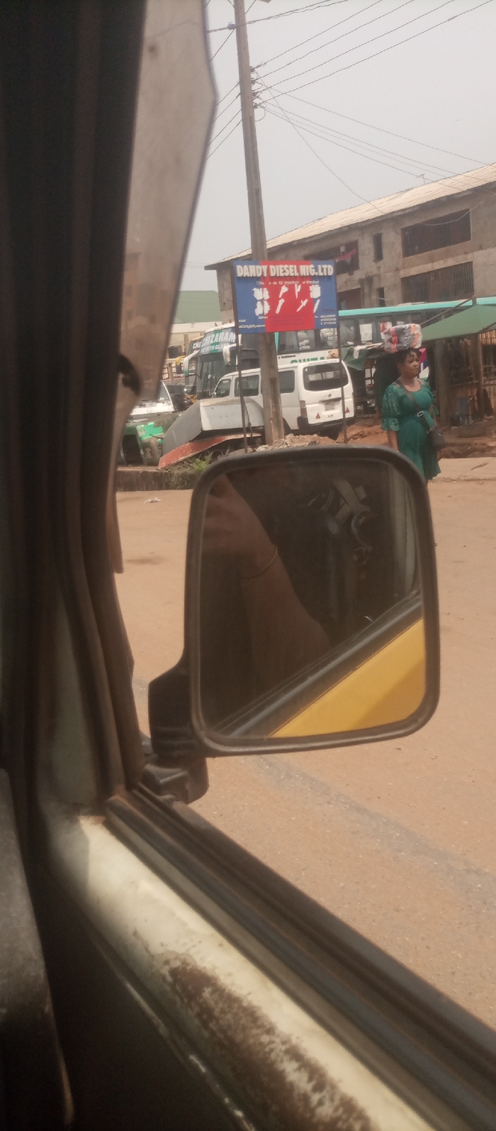The image depicts a street scene in Ogbunike, Nigeria, viewed from the interior of a vehicle. The immediate foreground shows the vehicle's interior door trim, a corroded white window sill, and a black-framed side mirror reflecting an arm and a yellow exterior panel. The road surface is unpaved, consisting of reddish-brown dirt. On the right side of the road, an adult female pedestrian walks from right to left. She wears a dark green dress, carries a dark shoulder bag, and balances multiple items on her head, secured by a colorful fabric. Further into the scene, several stationary vehicles are visible. These include a large white passenger bus, partially labeled "CHIKA ANARAM," a smaller white van, and a green heavy machinery unit (possibly a road roller or grader) positioned to the far left. A blue rectangular billboard prominently displays "DANDY DIESEL NIG. LTD" and graphic representations of engine components (pistons, injectors). Behind these vehicles and the billboard, a multi-story building with a light-colored exterior and dark rectangular openings is present. To the right of the pedestrian, a market stall with a green tarp roof is erected. A tall wooden utility pole supporting multiple overhead electrical wires stands on the left. The sky appears hazy or overcast.