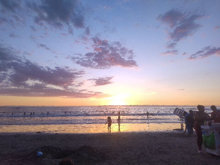 A vibrant sunset illuminates a beach scene. The sky is a blend of pink, purple, and blue hues, adorned with scattered clouds. People are wading in the ocean, their silhouettes appearing small against the glowing horizon. A group of people are gathered near the shore, standing by a cart. The beach is wide and sandy, reflecting the warm light of the setting sun.