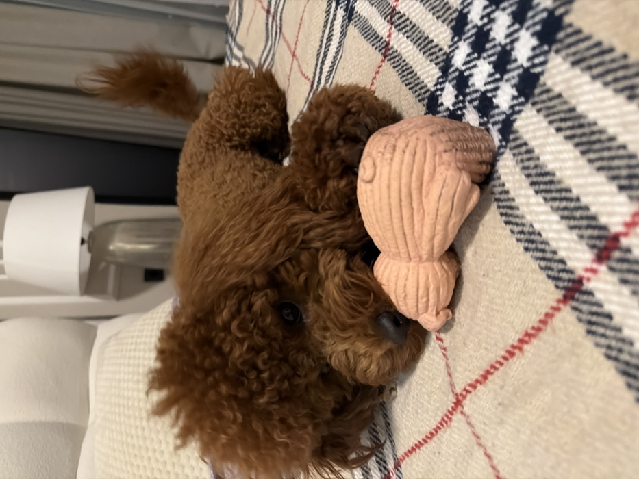 - "The image depicts a reddish-brown, curly-haired dog, resembling a poodle, lying on a beige plaid blanket" by FM-Fh83m2, licensed under CC BY 4.0