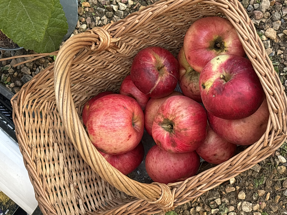 - "A light brown, woven wicker basket filled with approximately fifteen to twenty apples rests on a gravel surface in Mesnils-sur-Iton, France" by FM-2VH5m1, licensed under CC BY 4.0