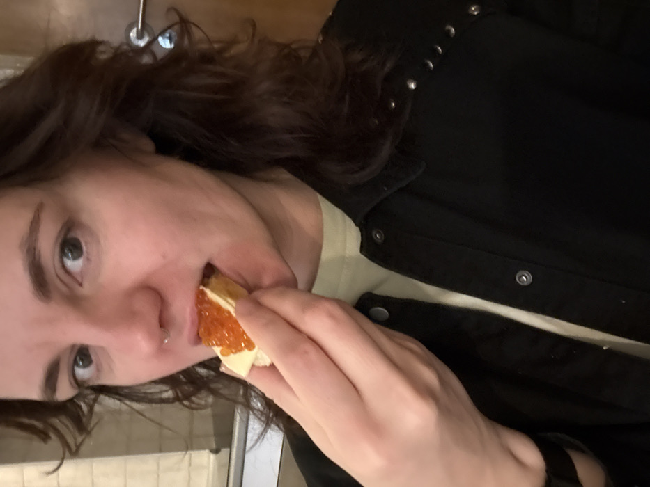 A female individual with dark brown, wavy hair and a silver hoop nose ring in her right nostril is captured in a medium close-up, looking directly at the camera. She is actively bringing a small canapé to her partially open mouth with her left hand. The canapé consists of a light-colored base, a spread of pale yellow (likely butter or cream cheese), and a generous topping of bright orange spherical roe (caviar). She is dressed in a light-colored crew-neck shirt worn under a black collared jacket featuring snap buttons and silver stud embellishments along the right shoulder and chest. A dark-colored band or watch is present on her left wrist. The background is out of focus, showing a light-colored structure with a dark horizontal line on the left, and a darker wall with a metallic door handle visible on the right, consistent with an indoor environment. This scene is located in the Palilula Urban Municipality, Serbia.