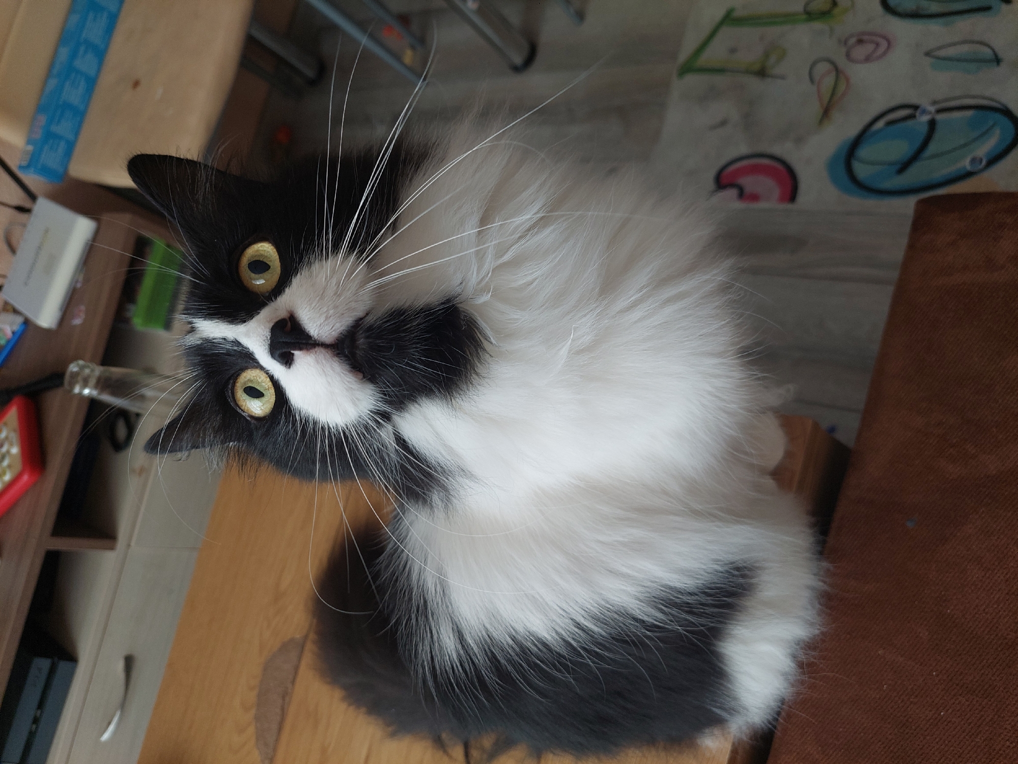 This scene is located in a domestic interior in Plovdiv, Bulgaria. The central subject is a domestic cat, medium-to-long-haired, exhibiting a black and white bi-color pattern. The cat is positioned on a light-colored wooden table surface, oriented towards the camera, and looking directly upwards with an alert expression. Its eyes display prominent yellow irises with vertically elongated pupils. The fur on its face includes a black patch extending from below the pink nose to the chin, contrasting with white fur on the muzzle and chest. Long white whiskers extend laterally from its muzzle. The immediate environment includes the wooden table surface beneath the cat. To the lower right, a brown, textured upholstered surface is visible. The background on the left features a light-colored wooden furniture unit, upon which a black rectangular electronic device, a red rectangular object, and a clear glass bottle are present. To the right, a wooden chair with metal legs is partially visible. The floor beneath the chair and in the right background consists of light-colored planks. A light-colored mat or rug with multi-colored, abstract, drawn designs (including a blue circle and a pink swirl) is partially visible on the floor in the lower right. Further blurred objects, including a silver electronic device, are visible on a shelf in the upper right background.