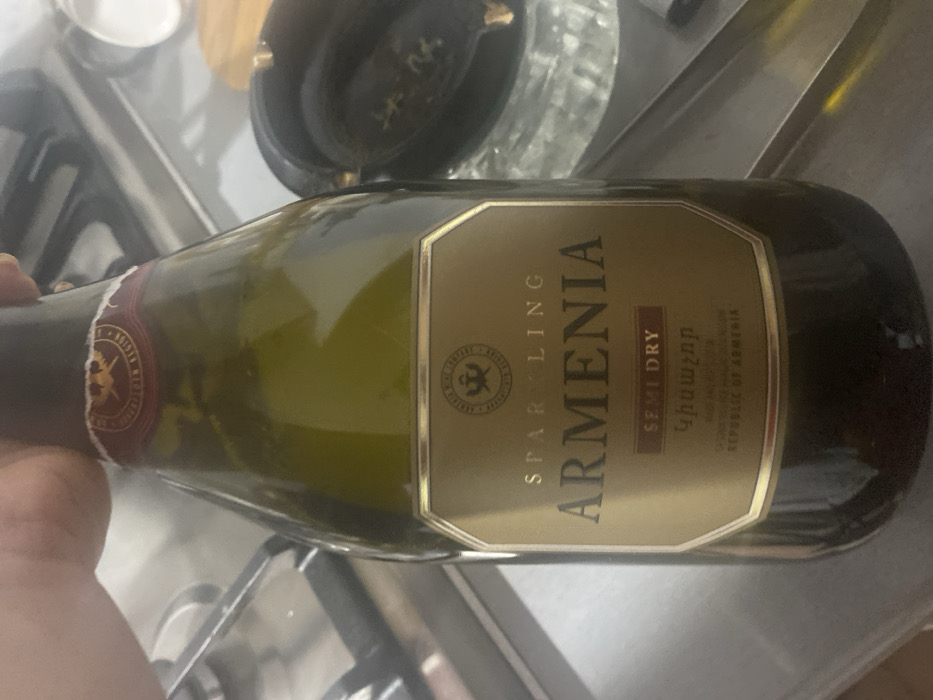 A close-up image depicts a hand holding a light green glass bottle of "SPARKLING ARMENIA SEMI DRY" wine