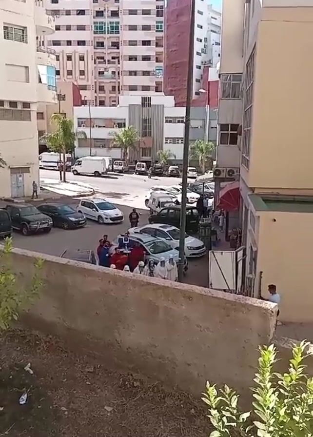 A high-angle shot shows a street scene in what appears to be an urban area. Several multistory buildings are visible in the background, and cars line the street. A group of people, some wearing white robes and others in red, are gathered near a car. People are also seen standing near a storefront with a red awning. A person appears to be recording the scene with a cell phone. Bushes and a concrete wall are in the foreground. The weather looks sunny. The camera is static.