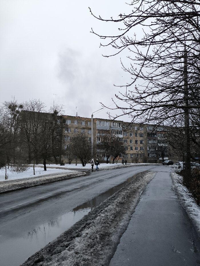 The image depicts an urban street scene in Vinnytsia, Ukraine, under an overcast sky during what appears to be late winter or early spring. The ground is characterized by melting snow and slush, with visible puddles on the wet asphalt road and dirty snowbanks lining the road and sidewalks. In the foreground, a two-lane wet asphalt road with reflective puddles extends from the bottom of the frame towards the background. Dirty, melting snow and slush are accumulated along the edges of the road. To the left of the road, a snow-dusted area features several bare deciduous trees and shrubs, some displaying clumps of mistletoe. A sidewalk partially covered in snow and slush runs parallel to the road. Two individuals, dressed in winter coats, are observed walking on or near the left side of the road, moving away from the viewer. Dominating the mid-ground is a weathered, multi-story apartment building, approximately five to seven stories tall, with numerous windows and balconies. A plume of light grey smoke or steam is visible rising from a chimney or vent on the roof of the building's leftmost section, ascending into the uniformly grey, overcast sky. Further down the street, closer to the apartment building, at least three additional pedestrians are visible. To the right of the road, a sidewalk, also wet and partially covered in snow, runs parallel to the street. Several parked passenger vehicles are discernible further along this side of the street, adjacent to the building. Bare tree branches, devoid of leaves, extend into the upper right portion of the frame. Utility lines are faintly visible against the sky.