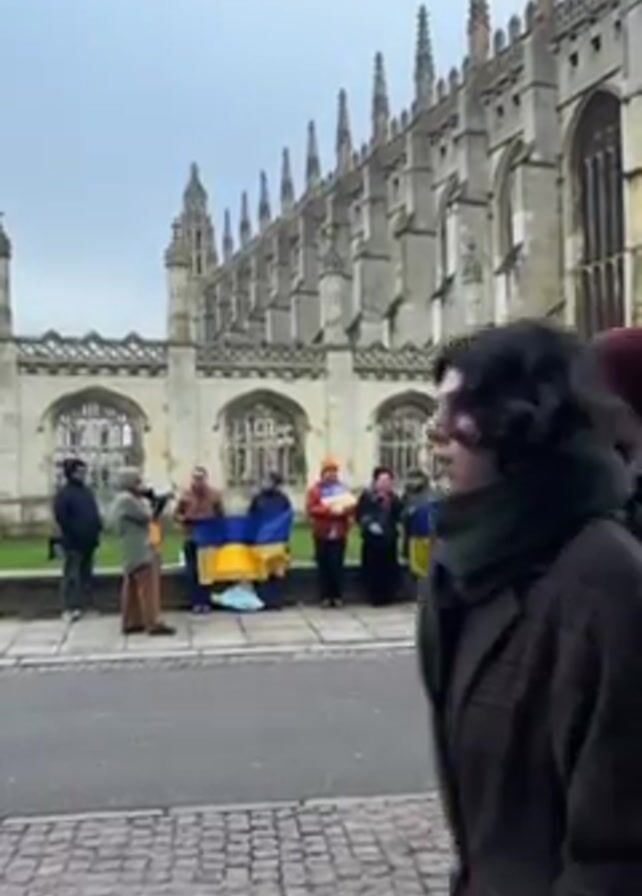 group of about a dozen people standing in front of a large stone building, holding Ukrainian flags. Most are standing but a couple of people walk past the group in the foreground. One person standing away from the group appears to be recording the event. There is a sign for a Fujifilm photo print service in the foreground. The weather appears overcast.