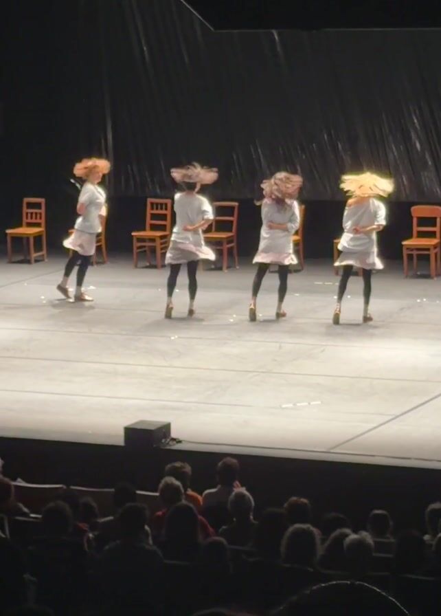performance on a stage with four women dancing. They are dressed in similar outfits - short gray skirts and white tops with dark leggings. The stage is minimalist, featuring several simple wooden chairs spaced out across the backdrop, and the back wall is a dark, metallic-looking curtain. An audience is visible in the foreground, seated in a darkened theater. The dancers move in unison at times, and at other times, they perform individual movements. The camera is stationary, capturing the entire scene from the audience's perspective.