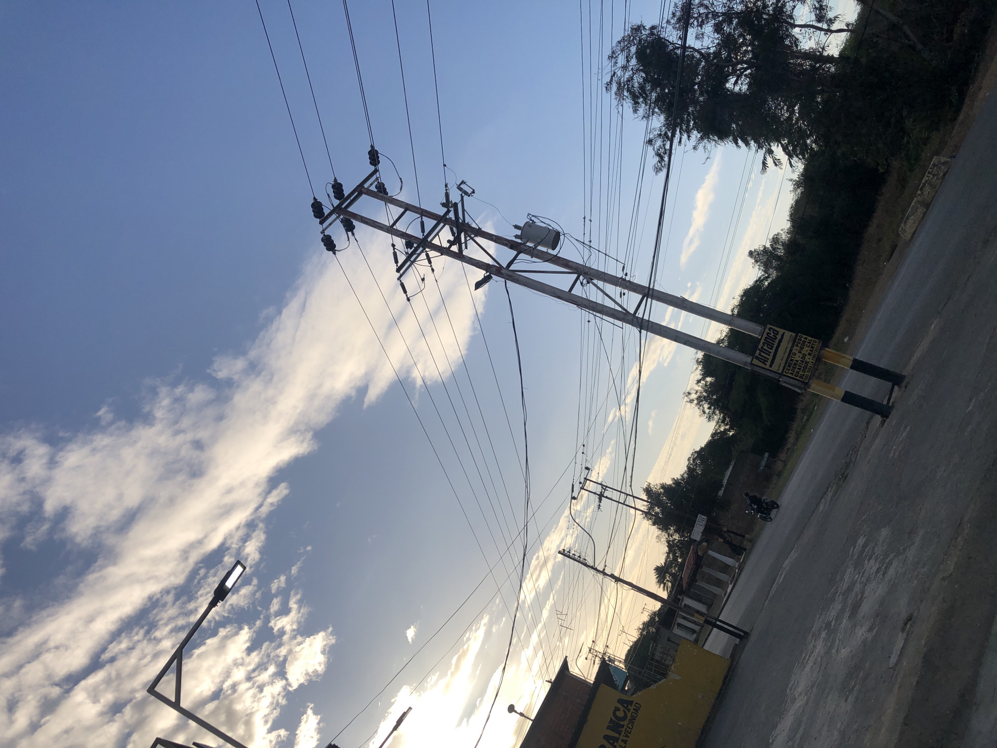 A low-angle shot captures a typical street scene in La Tagua, Venezuela. Overhead, power lines crisscross the sky, supported by utility poles. One pole dominates the frame, equipped with a transformer and insulators. A modern LED street light stands to the left. A billboard advertising construction materials is visible. A motorcyclist is traveling down the street. The sky is partly cloudy. Trees line the right side of the street.