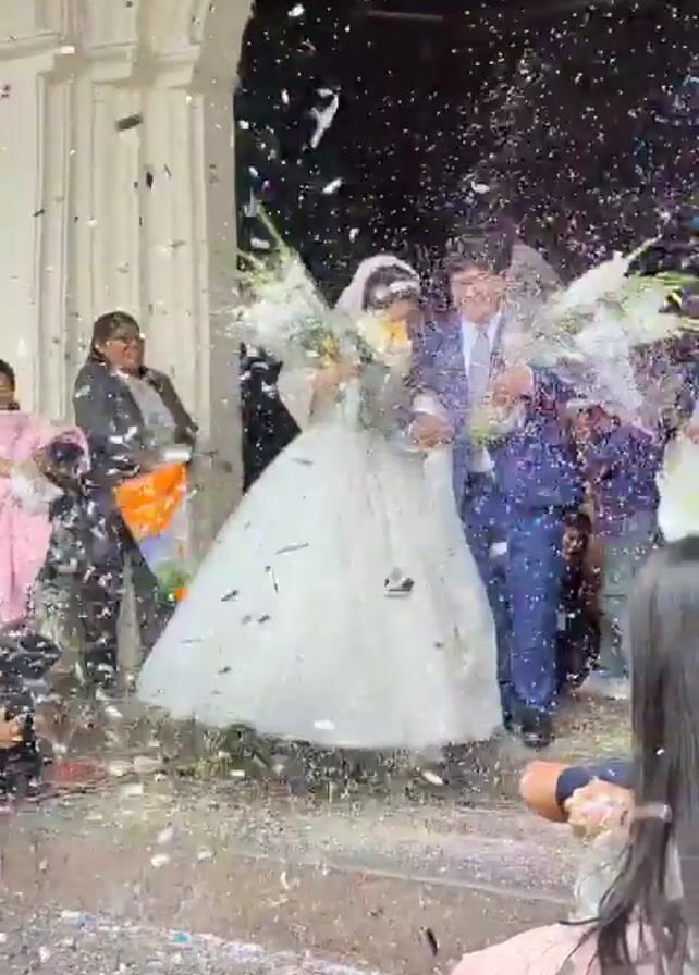 A just-married couple emerges from a church doorway, walking hand-in-hand as they are showered with confetti. The bride wears a white, sparkling ball gown and a veil, carrying a bouquet of white and yellow flowers. The groom is dressed in a blue suit and glasses, also holding a bouquet. Onlookers are visible on either side, some throwing confetti and others taking photos. A child in a striped shirt is visible in the lower left. The church entrance is adorned with an arched doorway.