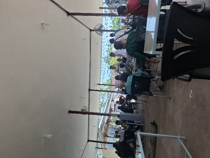 People gather at tables in a well-lit, open-air space. Tables and chairs are arranged in rows. A few individuals are seated, while others are standing near the tables. Overhead, beams support the structure, with small lights attached to the ceiling. Outside, trees are visible. The scene has a casual atmosphere, suggesting a social gathering or an outdoor dining area.