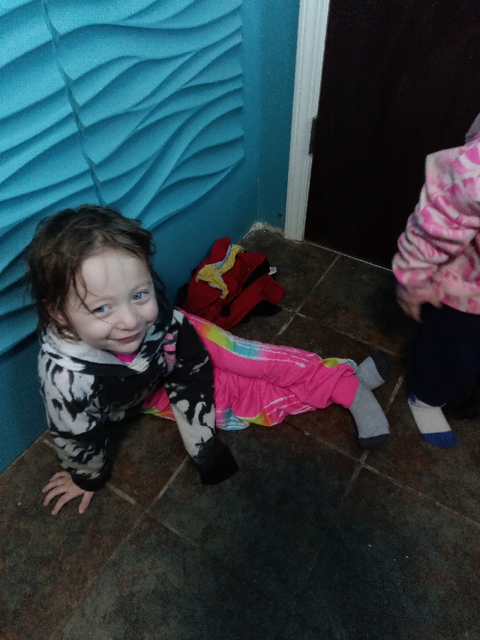 A young girl with dark hair, wearing a black and white hooded shirt and tie-dye pants, poses on a tiled floor against a blue textured wall. She is smiling at the camera. Next to her are some red and yellow clothes. Another child, wearing a pink patterned shirt and dark pants, stands partially in the frame on the right. A dark door is visible in the background.