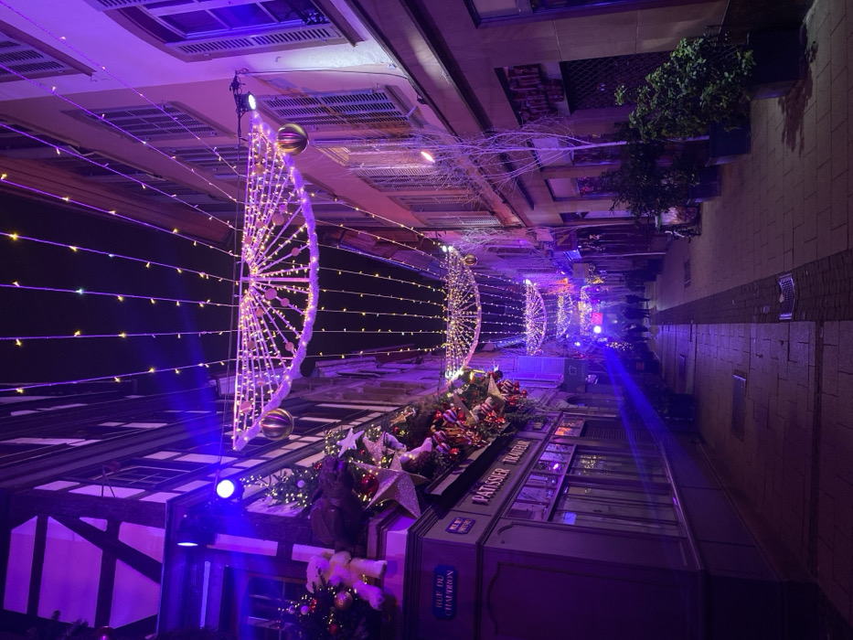 A street illuminated with purple lighting and festive decorations. Arched light fixtures are suspended above, adorned with gold baubles and white trim. Smaller strands of lights stretch horizontally across the street. A building is decorated with Christmas ornaments and greenery. Signage reads "PATISSIER TRAITEUR RUE DU CHAUDRON." The ground is paved. Trees in pots line the upper portion of a building.