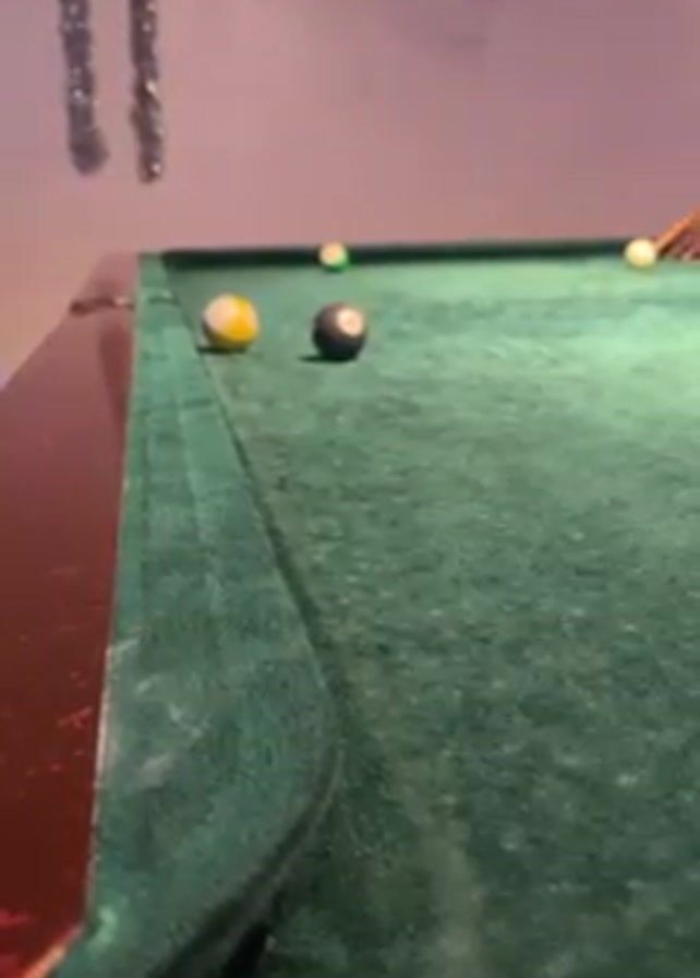The camera focuses on a pool table with a green felt surface in a dimly lit room