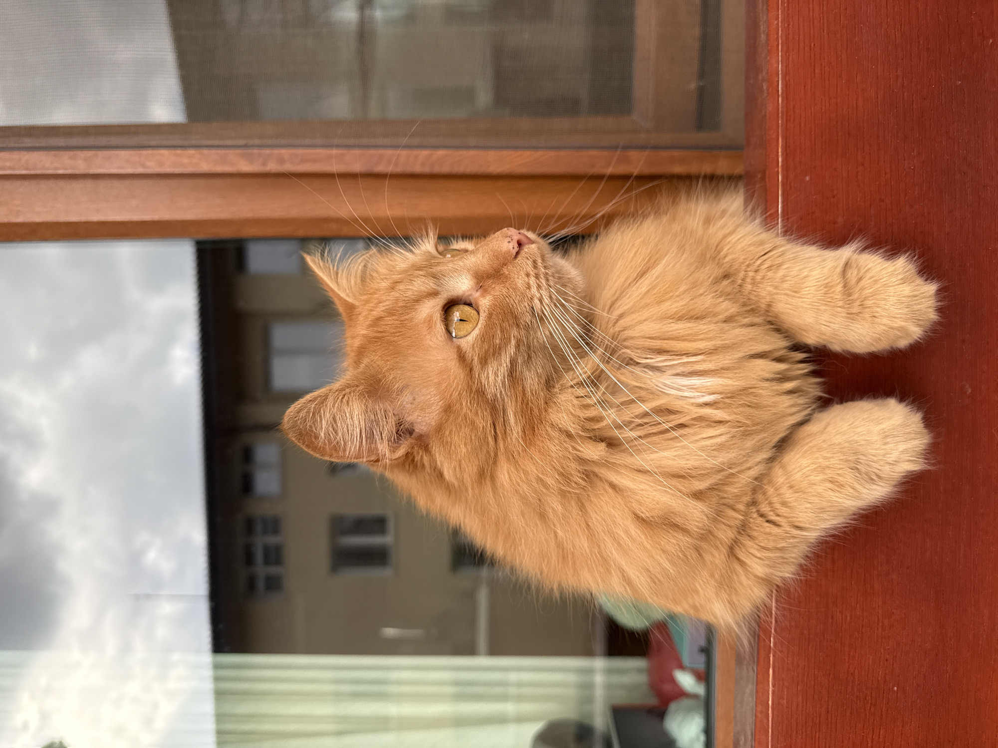 An orange, medium-haired cat with amber eyes, a pink nose, and prominent white whiskers is positioned in a window opening, resting its front paws on a reddish-brown wooden window sill