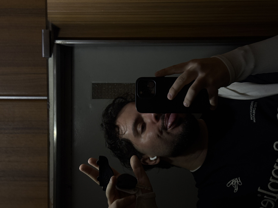 This image depicts a male individual taking a selfie in a reflective surface, identified as an elevator in Vila Nova de Gaia, Portugal. The precise address or building within Vila Nova de Gaia is not discernible. The subject is a male, appearing to be in his 20s or 30s, with dark, curly hair, a beard, and a mustache. He wears a dark t-shirt featuring an inverted white graphic and text, and a single white earbud in his left ear. He is using his right hand to hold a black smartphone, taking the photograph and partially obscuring the right side of his face. His left hand is raised, holding a set of keys, which include a standard metal key and a black, stylized key fob. The individual's tongue is slightly extended in a casual pose. The background consists of a dark, reflective panel and wooden paneling above it, consistent with an elevator interior. A horizontal metallic strip is visible across the top edge of the reflective surface. The scene is dimly lit.