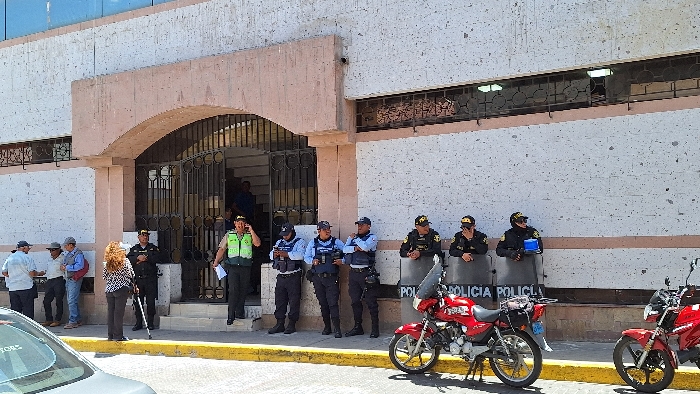 The image displays the exterior of a two-story building in Miraflores, Peru, characterized by a light-colored, textured facade and a prominent arched entrance with a dark metal gate. Steps lead up to the entrance. A significant police presence is observed. To the left of the entrance, one officer in a dark uniform with a light green reflective vest is speaking on a mobile phone while holding papers. Adjacent to the entrance, a dark-uniformed officer stands. To the right of the entrance, four officers in light blue shirts, dark pants, and protective vests are positioned in a line. Further right, four officers in dark uniforms with dark caps are standing, some positioned behind grey rectangular shields visibly marked "POLICIA" in white capital letters. One of these officers wears a blue flashing light on their vest. To the far left, near the building's steps, a group of three to four men in casual attire, including hats, are gathered and appear to be conversing. In the immediate foreground, a woman with curly brown hair, wearing a patterned top and dark pants, stands facing away from the camera, holding a white cane or walking stick. On the street level in the foreground, two red motorcycles are parked to the right of the frame, positioned near a yellow curb line. One motorcycle displays a partially visible blue license plate. A light-colored car is partially visible in the bottom left corner. The sky above is clear.