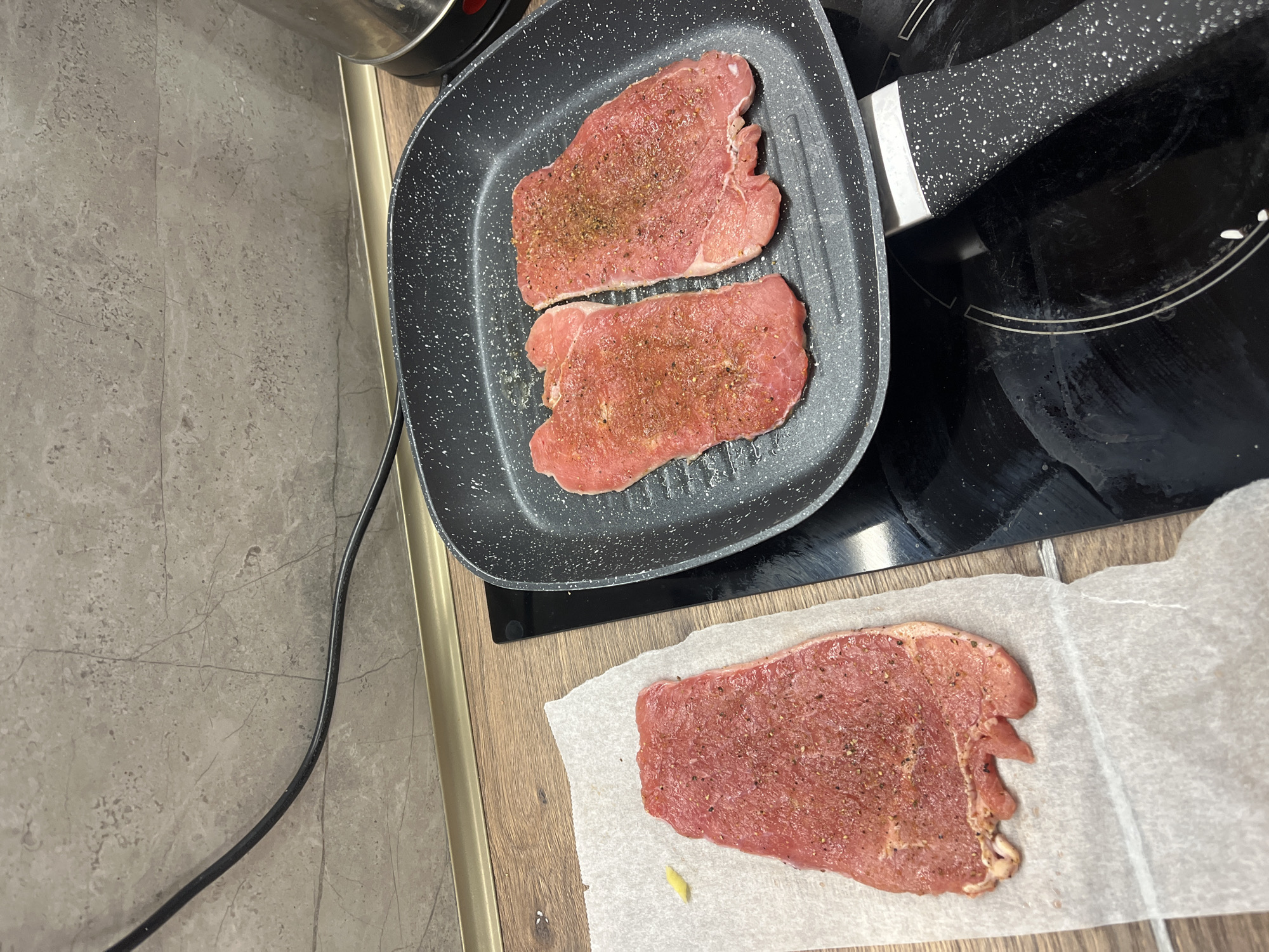 kitchen scene. Two pieces of seasoned meat are cooking in a grill pan on a black stovetop. A third piece of seasoned meat rests on a piece of white parchment paper next to the stovetop. There are no people visible. A power cord is visible on the left side of the image. The precise location in Varna, Bulgaria cannot be determined from the image.