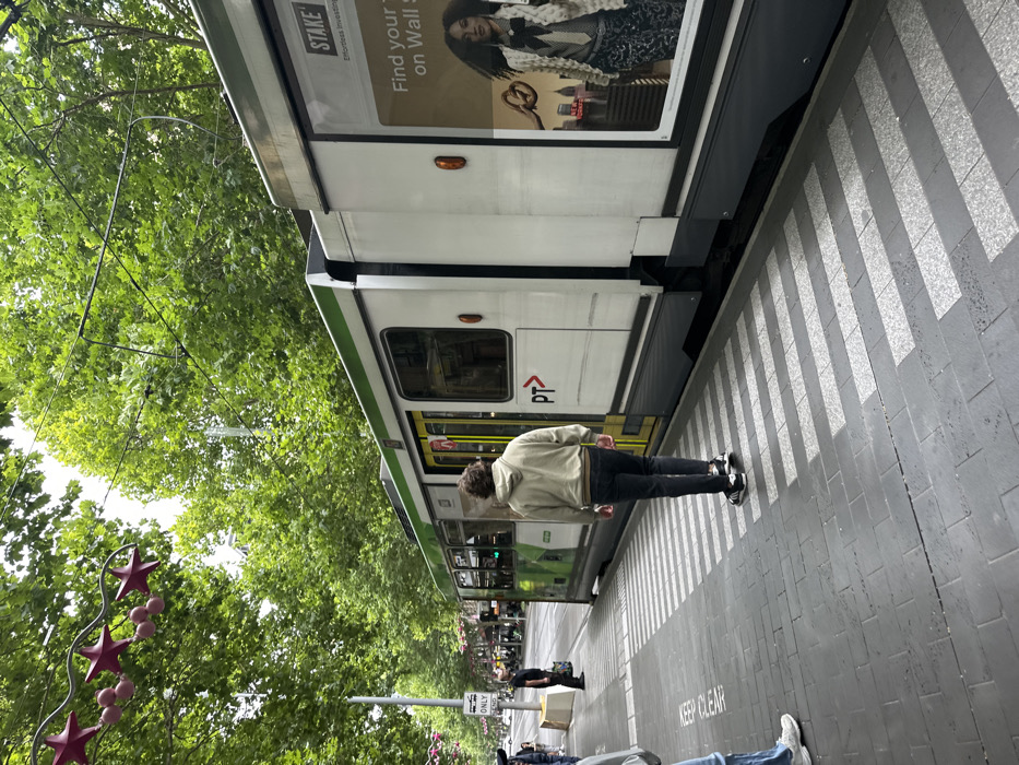 - "A pedestrian stands on a striped crosswalk next to a long, white and green tram" by FM-P0ePn2, licensed under CC BY 4.0