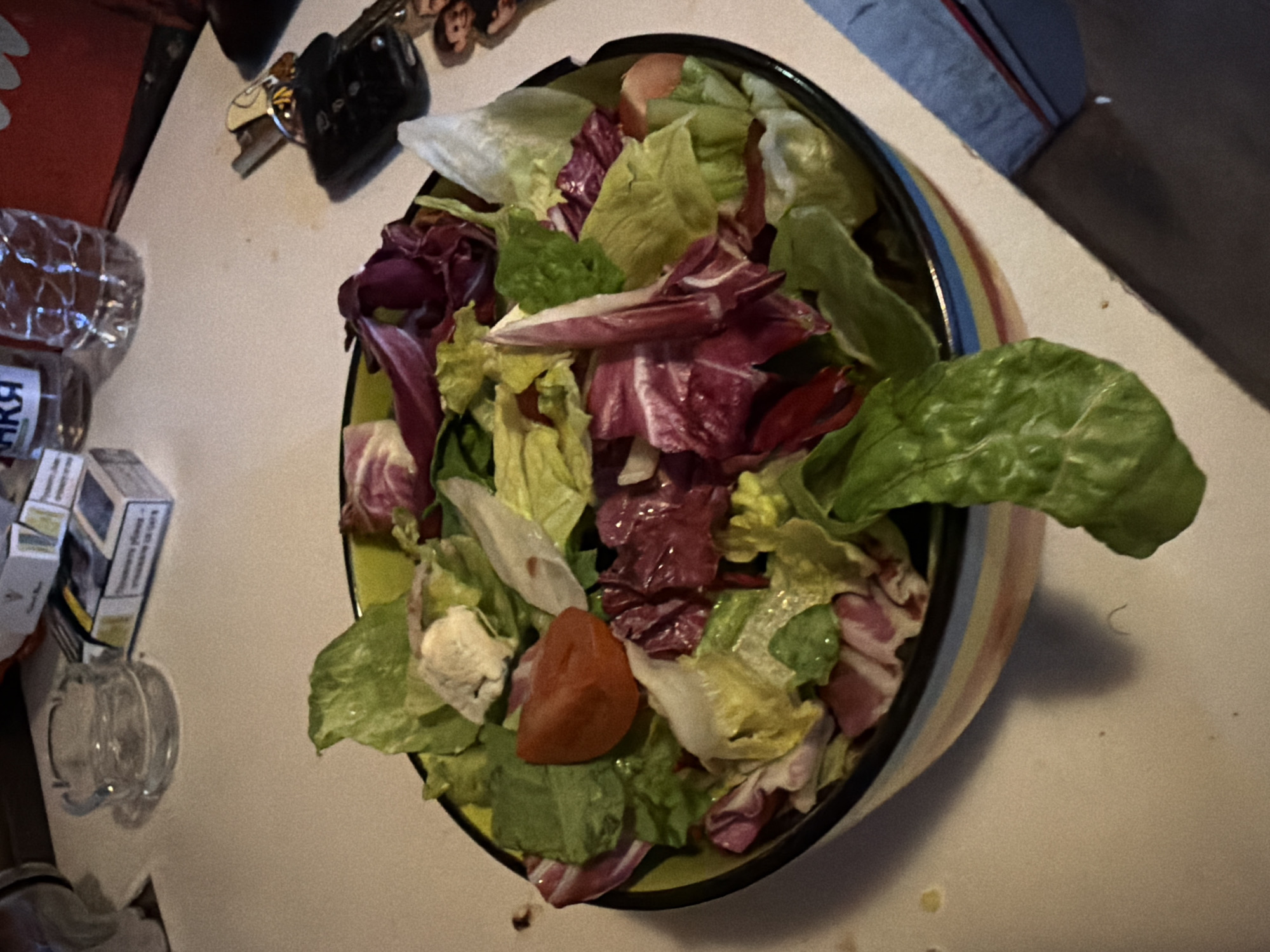An indoor tabletop scene in Sofia, Bulgaria, displays a large, multi-colored striped ceramic bowl centrally filled with a mixed green and red leaf lettuce salad. The salad contains visible pieces of red tomato and white, crumbled cheese-like material. Surrounding the bowl on the light-colored table are various objects: to the upper left, a clear glass ashtray is positioned next to multiple cigarette packs bearing Cyrillic script. Behind these items, a clear plastic bottle labeled "МЯКА" (MYAKA) in Cyrillic is visible. To the upper right, a set of vehicle keys with a dark fob is present alongside another clear plastic water bottle. A small, partially visible rectangular object depicting two figures lies beneath the keys. A red container is visible in the upper right background. The lighting is ambient. No individuals are present, and no direct actions or interactions are depicted.