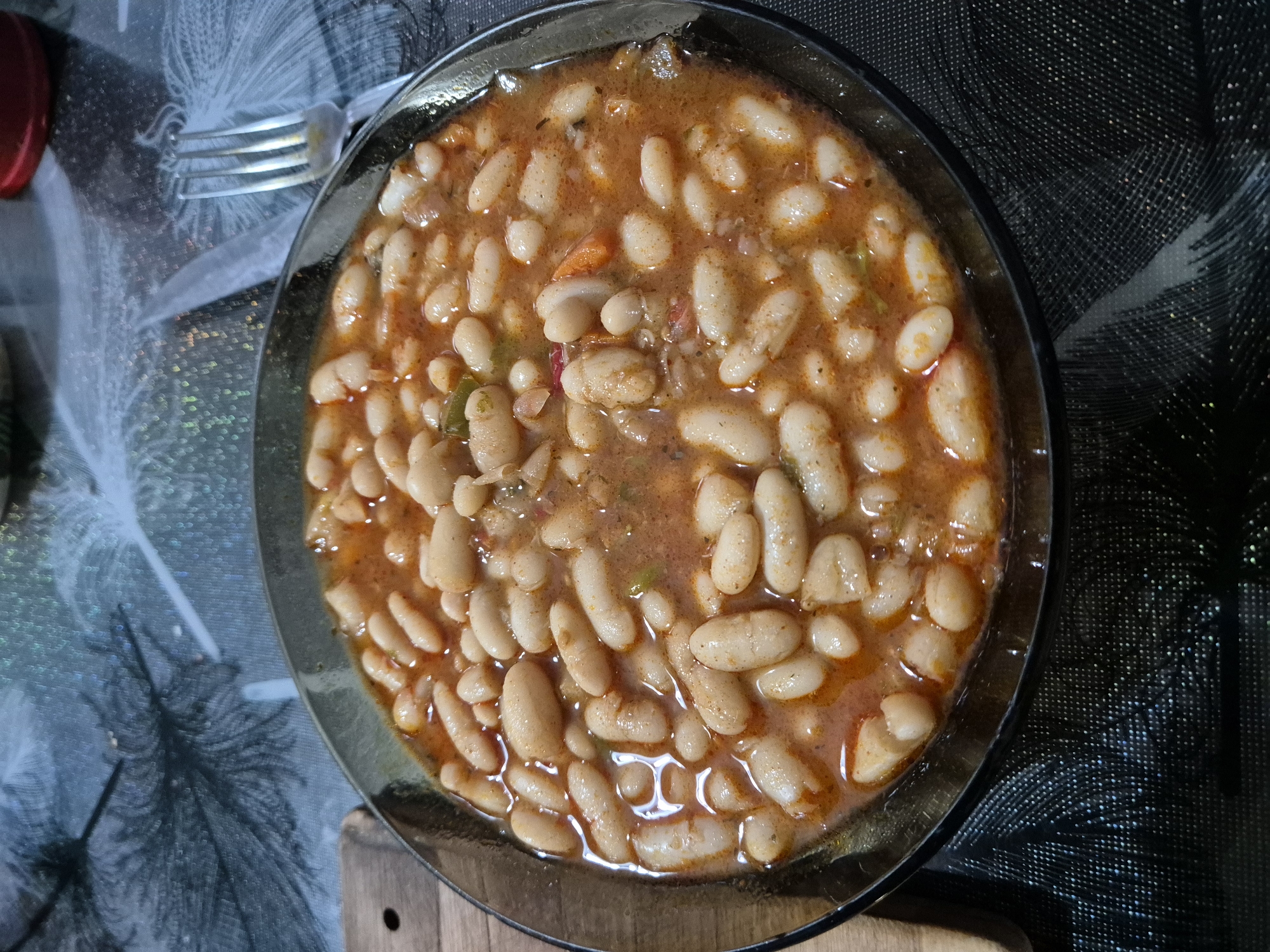 - "A top-down shot shows a clear glass bowl filled with white beans in a reddish sauce" by FM-Ra3hq2, licensed under CC BY 4.0