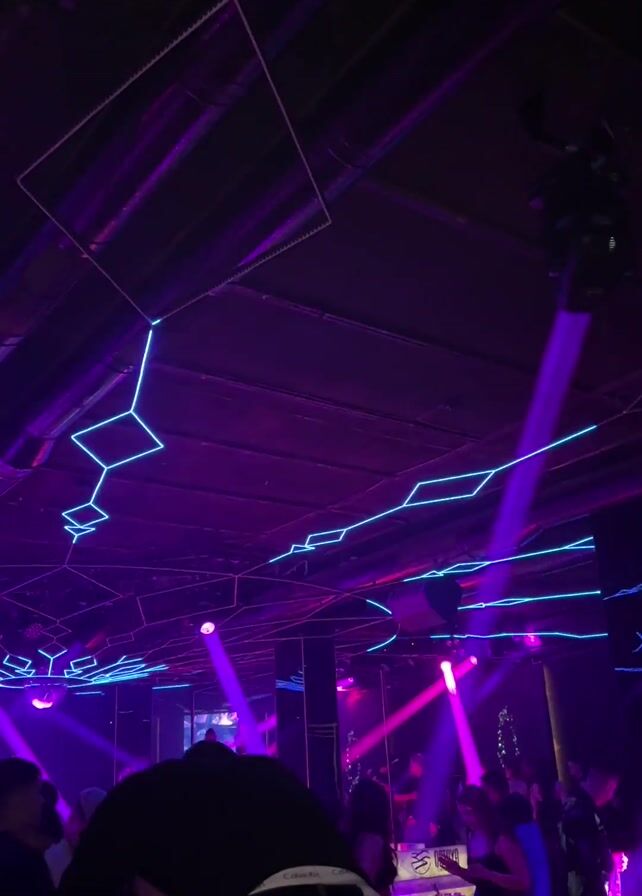 interior of a nightclub, filled with people socializing. There are men and women standing, walking, and seemingly dancing. Overhead, the ceiling is black with visible ductwork and is adorned with blue neon-style square and line lights. Powerful spotlights emit beams of white, blue, and pink light, creating a dynamic and colorful atmosphere. The camera seems to be held at a low angle, focusing on the lights above and the crowd in the background. The view is partially obstructed by a person in the foreground wearing a dark shirt and khaki pants, whose underwear band is visible.