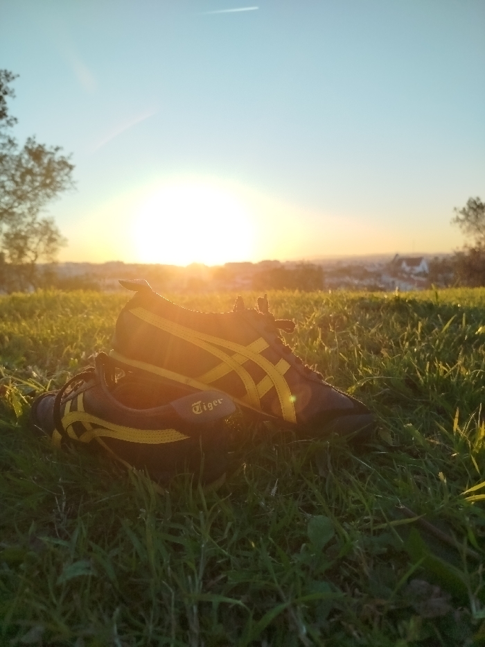 A pair of dark athletic shoes, identified by yellow stripes and "Tiger" branding on the heel, rests on vibrant green grass in the foreground. One shoe is partially stacked upon the other. The scene is illuminated by a prominent, low-lying sun near the horizon, indicating either sunrise or sunset, which casts a bright yellow-orange glow and creates lens flares across the image. In the midground and background, a sprawling urban landscape of distant buildings, some with white roofs, is visible through a atmospheric haze. Silhouetted trees frame the left and right edges of the view. The sky above is clear, transitioning from bright yellow near the sun to a pale blue, with a faint airplane contrail present in the upper sky. This elevated grassy location, overlooking a significant portion of the city, is consistent with viewpoints found within Parque Florestal de Monsanto in Lisbon, Portugal. No individuals are present in the image.