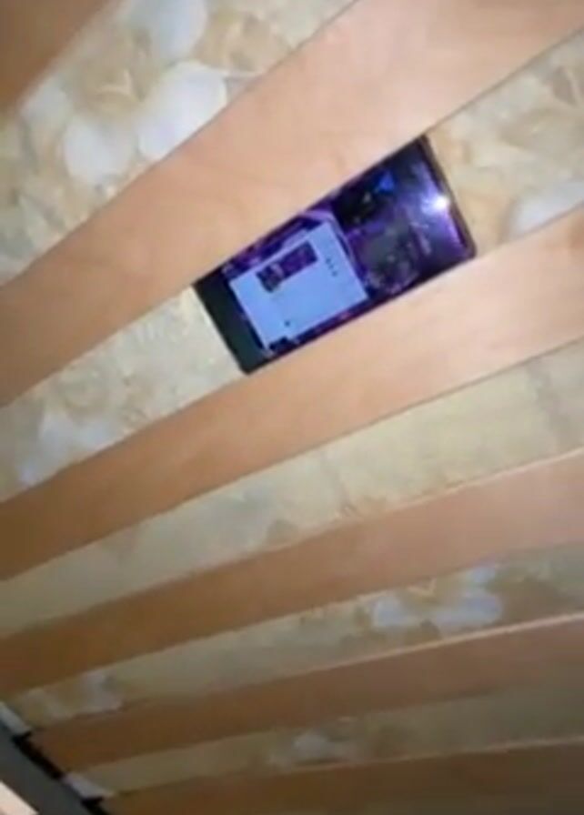 A mobile phone is wedged between the wooden slats of a bed frame, playing a video