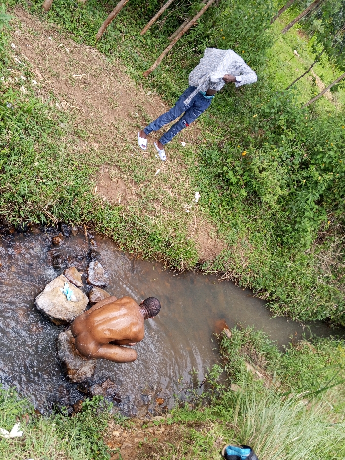 The scene is set outdoors in what is identified as Borabu Chitago ward, Kenya, viewed from an elevated perspective overlooking a natural gully containing a stream. A narrow, murky brown stream flows through the lower half of the image, bordered by banks covered in green grass, weeds, and dense shrubbery. Several thin, light-colored tree trunks are visible in the background, extending vertically. Two adult males are present. One individual with dark skin is partially submerged in the stream, positioned in a crouch or kneeling posture, facing away from the camera. This individual appears unclothed from the waist up, with a bare, wet back and buttocks visible. They are situated amidst several rocks in the shallow water. A small, light-colored, possibly fabric object rests on a large rock adjacent to this individual in the stream. The second individual, also with dark skin, stands on the higher dirt and grass bank above the stream. This person is wearing blue jeans with white patterned details and a light-colored, long-sleeved, possibly plaid or textured shirt. White slip-on shoes are worn on their feet. Their head is turned away from the camera, and their arms are bent at the elbows, held close to their torso. The environment includes scattered small pieces of white litter on the grassy bank. A pair of blue and black shoes is partially visible in the bottom right corner of the frame.