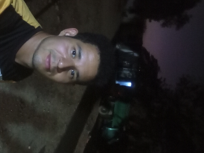 A dimly lit selfie featuring a man with dark hair, light skin, and a black and yellow shirt. He looks towards the camera with a slight smile. The background is very dark, obscuring details, but appears to be outdoors at night. A blurry object with a blue light source is visible behind him, possibly part of a vehicle or equipment. Some tree outlines are also present in the background. The image has a low-light quality.