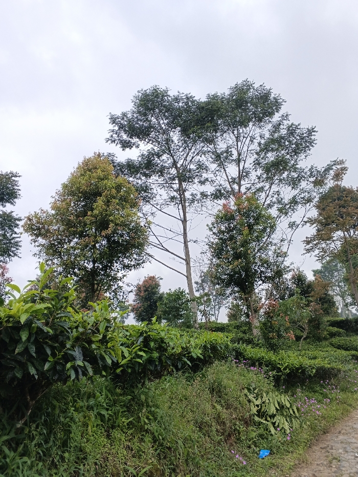 The scene depicts an outdoor rural agricultural landscape, specifically a tea plantation, under an overcast grey sky. The lower foreground consists of dense, untended green foliage, including various grasses and small plants with scattered pink blossoms, bordering a visible section of a light-colored unpaved path on the right. A small, blue, unidentified piece of debris is present on the ground within the wild vegetation. The midground features multiple rows of meticulously maintained, dark green tea bushes extending across the frame and ascending a gentle slope. Several taller trees of various species, exhibiting dark green, lighter green, and reddish-brown foliage, are scattered throughout the plantation. The background shows additional tree-covered terrain and hills fading into the hazy sky. No individuals, structures, or animals are visible. The location is an undetermined rural agricultural area in Vietnam, consistent with tea-growing regions.
