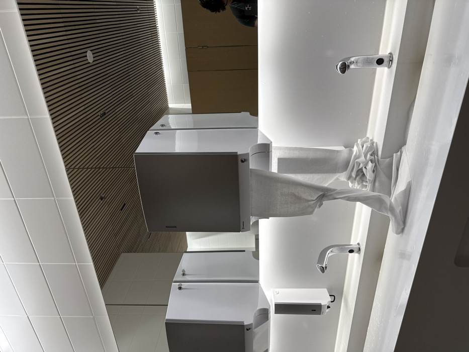 modern bathroom. The sinks are white and sleek with minimalist silver faucets. A crumpled white cloth hangs between a sink and a wall-mounted dispenser. Above the sinks are rows of recessed lights set into a slatted wooden ceiling. The wall is tiled with large white squares. The overall impression is one of clean, modern design.