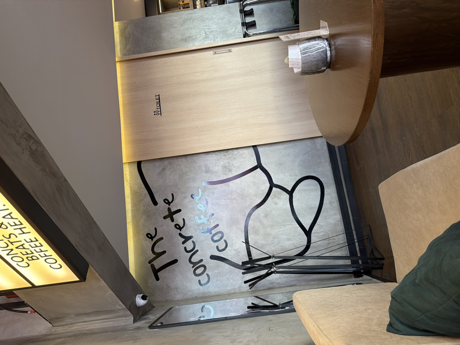 A modern interior showcases a gray wall with the text "The Concrete Coffee" and a stylized coffee cup drawing