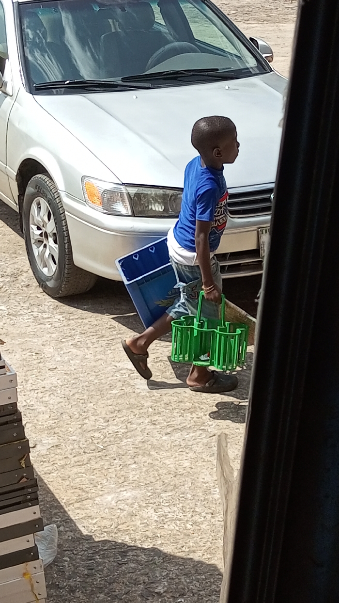 An outdoor scene in Ogbunike, Nigeria, depicts a young male child walking from left to right across a light-colored, textured ground surface. The child, wearing a blue short-sleeved t-shirt, blue denim shorts with a white undergarment visible, and brown flip-flops, carries a green plastic six-bottle carrier in his right hand and a blue plastic crate tucked under his left arm. He has a light-colored bracelet on his right wrist and a closely cropped haircut. Behind the child, a silver sedan, consistent with a Toyota Camry, is parked or stationary, with its front passenger side wheel and headlight visible. The scene is illuminated by bright daylight, casting distinct shadows on the ground. Stacked metallic or wooden objects are partially visible on the far left, and a dark vertical structure partially obstructs the right side of the frame.