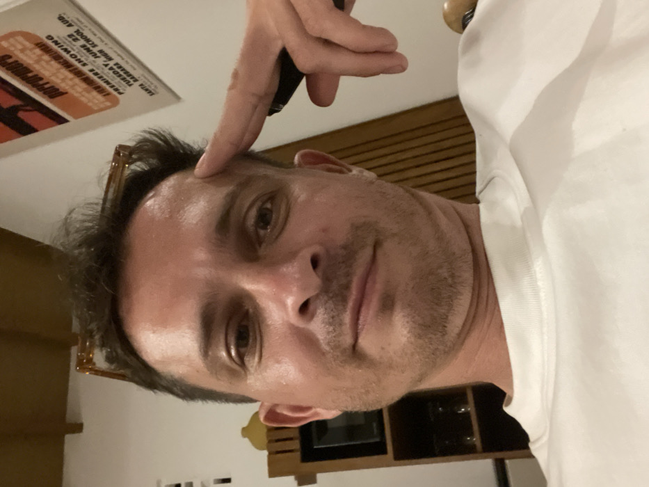 An adult male is depicted in a close-up, selfie-style photograph taken indoors in Jimbaran, Indonesia
