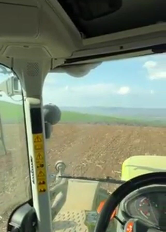 driver's perspective from inside a modern tractor moving through a cultivated field