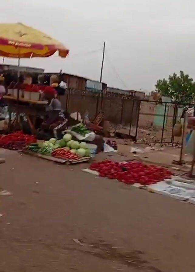 The video appears to have been recorded from a moving vehicle driving on a paved road through an outdoor market. Many people are present and moving around the area. There are tomatoes laid out for sale on the ground and on tables. Other types of produce are also visible, possibly including some green vegetables. Several stalls or makeshift shops are evident, some with umbrellas providing shade. Vehicles, including a car and a motorcycle, can be seen moving or parked in the vicinity. Signs are visible, including one that says "POS." The environment is relatively urban, with buildings and power lines visible in the background. The sky is overcast.