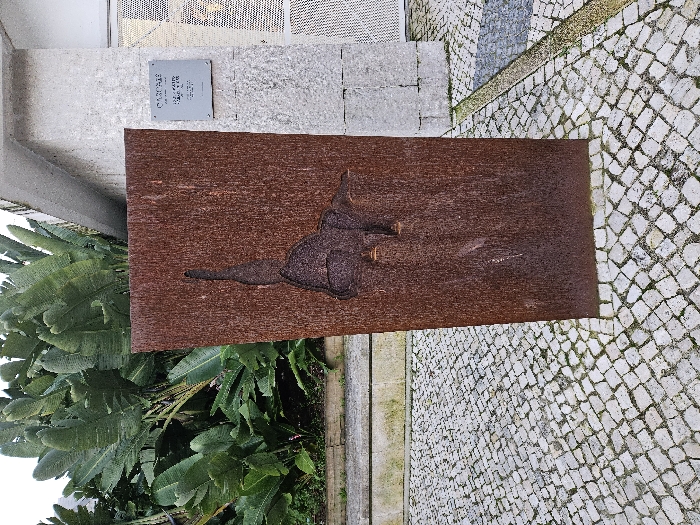 - "An outdoor scene featuring a rusted metal plaque with an engraved figure lying down, mounted horizontally" by FM-yfXT73, licensed under CC BY 4.0