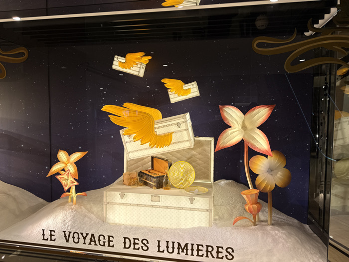 This image depicts a luxury retail store display window located in Chaoyang District, Beijing, China. The scene is set against a dark blue background featuring numerous small white dots, simulating a starry night sky. The base of the display is covered with a white, textured material resembling snow or clouds, arranged in undulating mounds. Prominently featured are multiple Louis Vuitton trunks, primarily in a white or cream color with the brand's distinctive monogram pattern. One large, open white trunk rests on the central white mound, with another closed white trunk positioned beneath it. A third open white trunk appears to be floating above the central display, with large, golden, stylized wings attached to its sides. Additionally, three smaller, darker-colored trunks, also equipped with golden wings, are suspended higher in the "sky," further to the left. Within the open trunks on the display base, various golden objects are arranged, including a dark-colored miniature trunk with an orange interior, a golden spiral-patterned disc, and other metallic-toned accessories. The display is further adorned with multiple stylized, illuminated floral structures. These flowers feature petals in shades of white, orange, and yellow, and are positioned on the white mounds. Some are large, multi-petaled blooms, while others are smaller and more thistle-like. Curved, dark brown or golden ribbon-like elements are visible framing the upper and right edges of the display. At the bottom center of the display, in dark, capital letters against the white base, the French text "LE VOYAGE DES LUMIERES" is prominently visible, translating to "The Journey of Lights." The entire display is brightly lit, emphasizing the objects and decorative elements. No individuals are present in the scene.