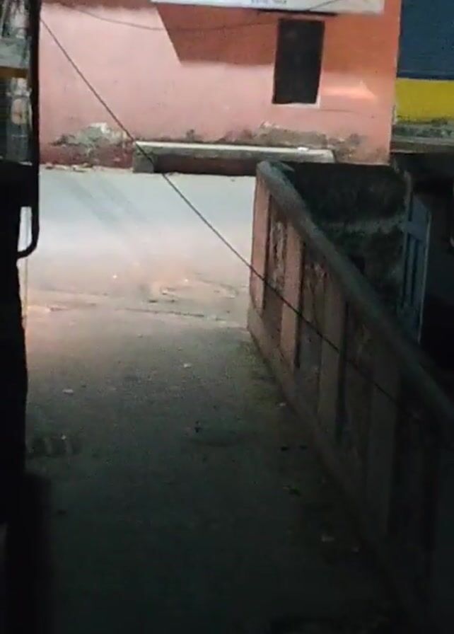A white car drives along a narrow street at night, passing in front of a small building with the sign "Boys' Sporting" written in English and another language. The street is dimly lit, and the perspective is from a dark, narrow passage, partially blocked by a stone wall or fence. Above, there are electrical wires running across the scene.