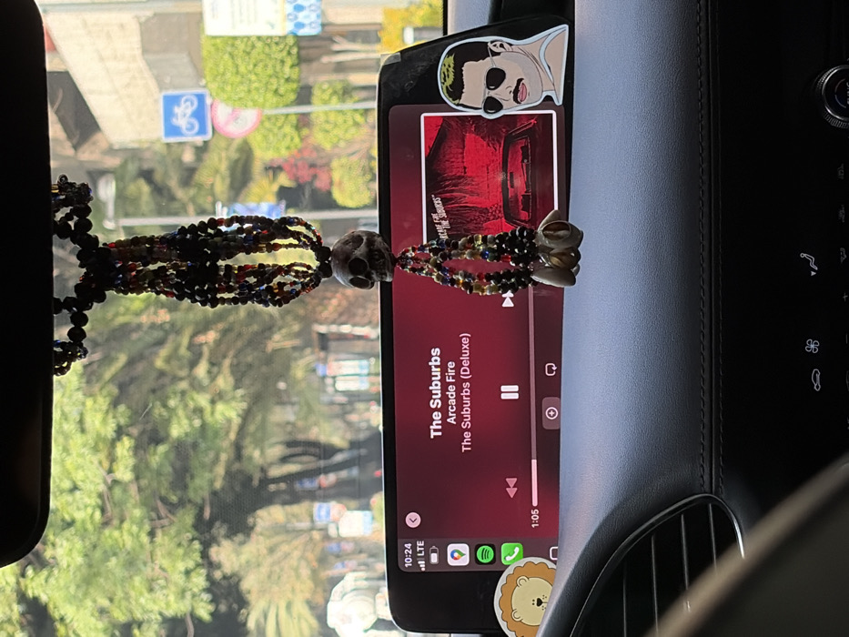 An in-car display shows "The Suburbs" by Arcade Fire on Spotify. The screen also features a Freddie Mercury sticker and a cartoon lion. A beaded necklace with a skull pendant hangs in front of the screen, along with additional beads and seashells. The car's dashboard and climate controls are partially visible. Outside the car, trees and street signs are visible.