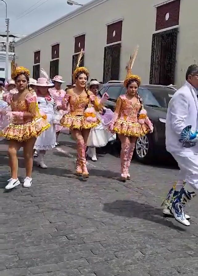 procession on a cobblestone street. Several women in colorful costumes with short skirts, boots, and ornate headdresses are walking towards the camera. Some women are wearing white dresses and hats. A man in white is walking beside them. A dark SUV is parked on the side of the street. A light-colored building with dark window grates is visible in the background. There are overhead wires and light posts.