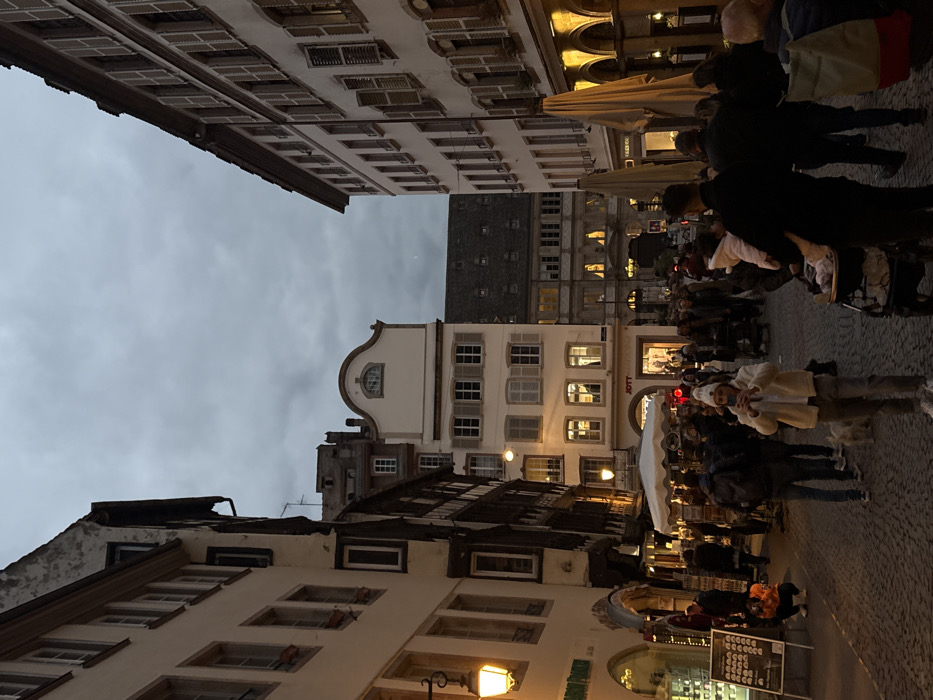This image depicts a densely populated pedestrian thoroughfare in Strasbourg, France, under an overcast sky requiring artificial illumination