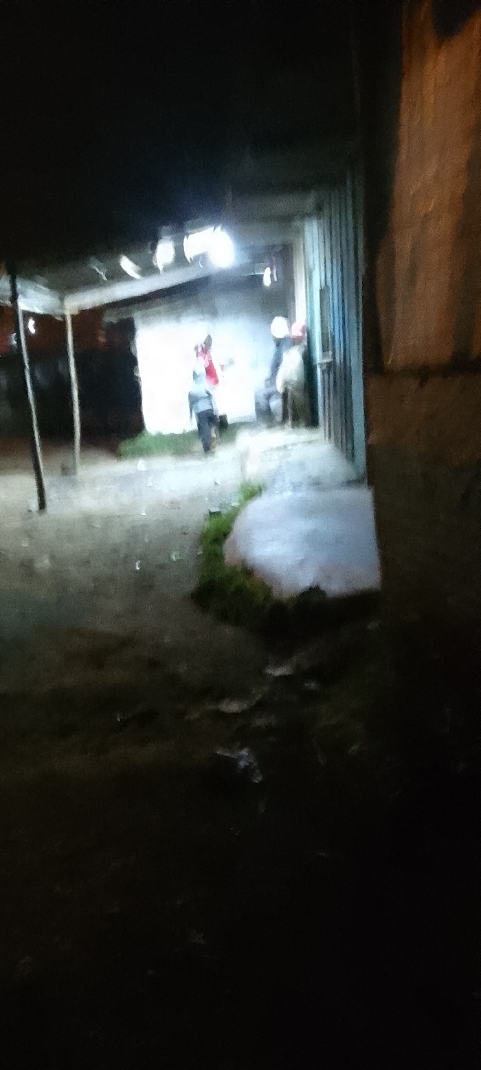 Under an overhang lit by several bright bulbs, two figures stand near a metal gate. One figure is blurry, wearing a red shirt, and the other seems to be interacting with the gate. The ground is a mixture of dirt and concrete, with some vegetation growing in patches. The foreground is shrouded in darkness. A partial wall is visible on the right side of the frame.