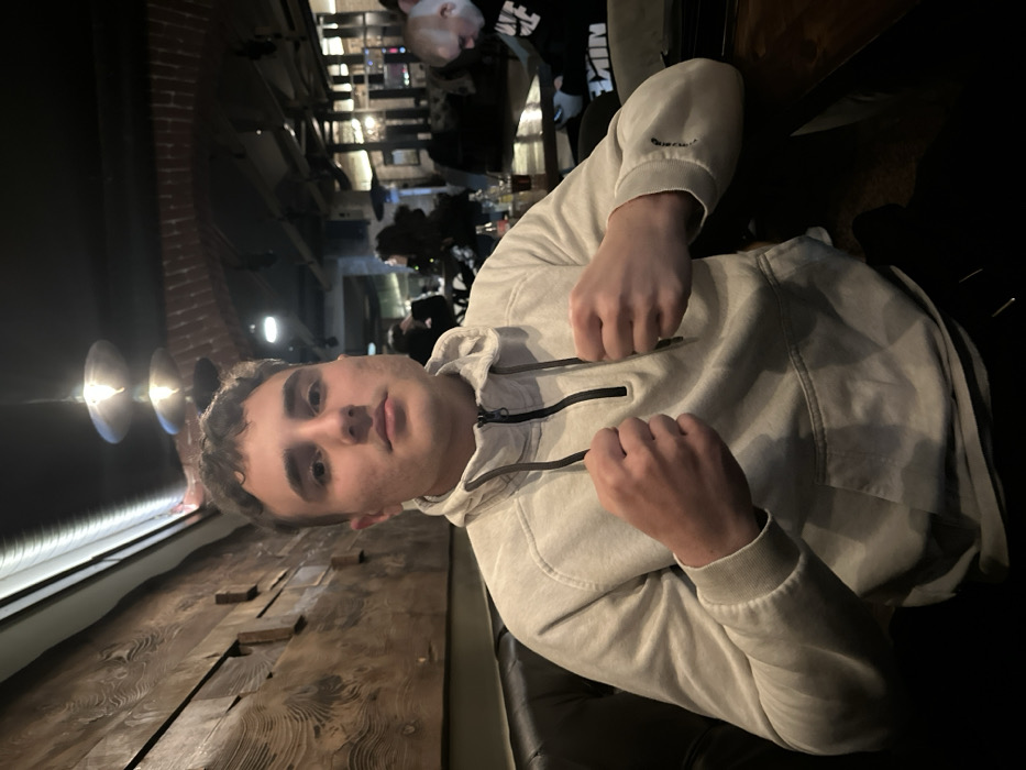 A young male, approximately late teens to early twenties, is seated in a dimly lit indoor establishment in Silistra, Bulgaria. He faces the camera directly with a neutral expression, wearing a light grey, quarter-zip hoodie with black drawstrings and a front pouch pocket. His hands are clenched into fists and held elevated in front of his chest. He is seated on a dark, possibly leather, upholstered bench or booth. The background features a wall with textured wooden paneling to the left, and a dark ceiling with exposed elements and metallic, dome-shaped pendant lights. In the midground and background to the right, several other individuals are visible, blurred, occupying seating areas. One individual with closely cropped light hair is discernable on the far right, looking downwards. Brick arches are visible within the background architecture. The overall scene suggests a cafe, bar, or restaurant setting.