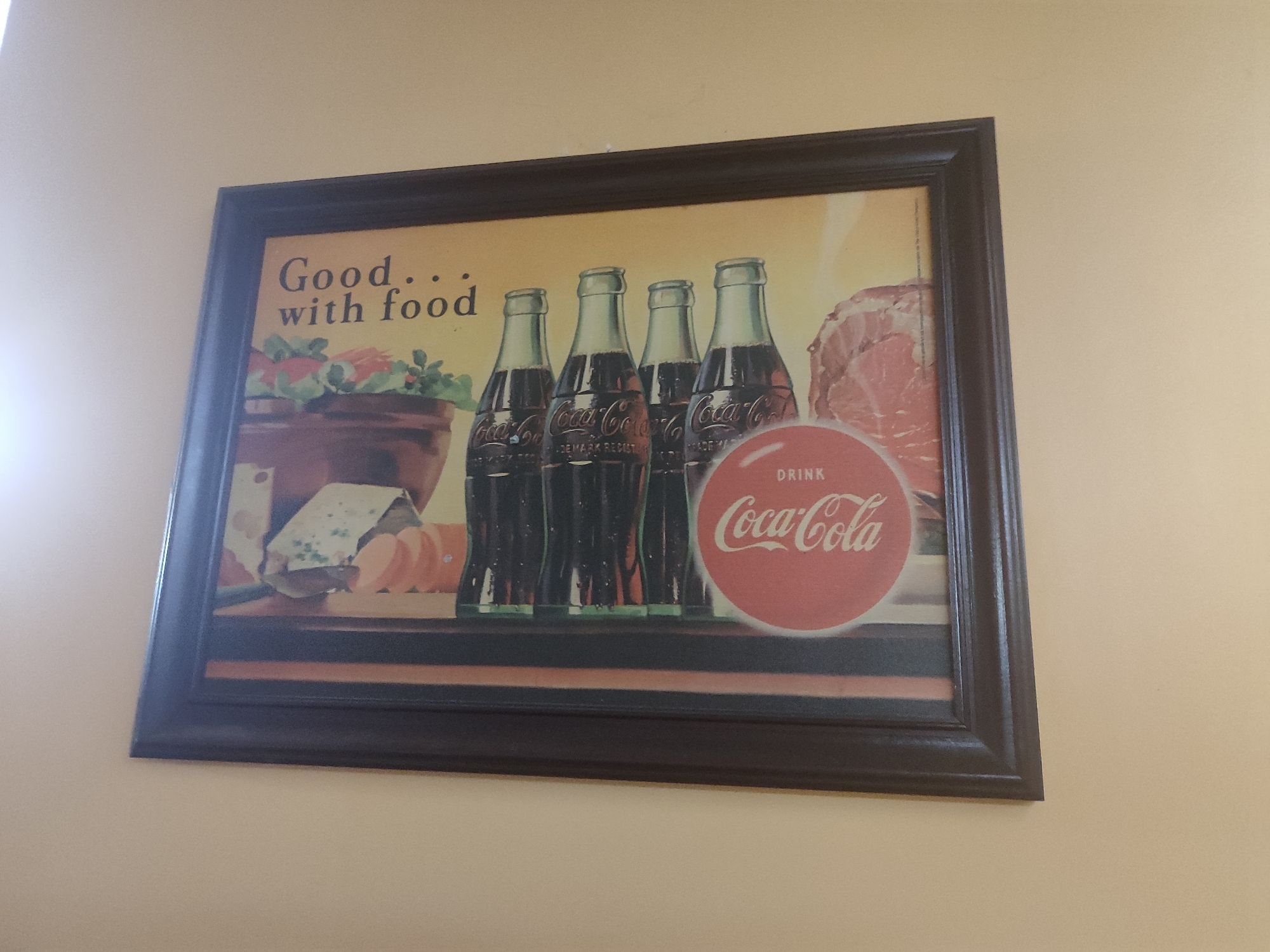 framed vintage Coca-Cola advertisement hanging on a light yellow wall