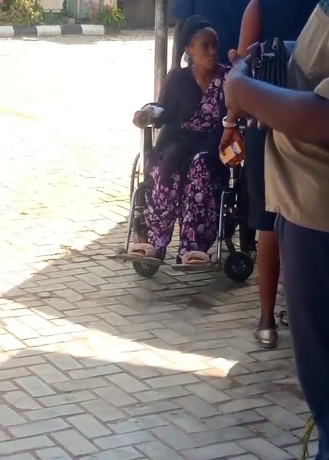 A woman wearing a dark headscarf and a purple floral outfit sits in a wheelchair on a brick-paved surface. Several other individuals stand around her. One person in a blue shirt and face mask stands directly behind her. Another person, wearing a tan shirt and navy blue pants, stands to the right, holding a small orange and white box. Behind them are more people, including a woman in a colorful patterned dress. The scene is bright and sunny.
