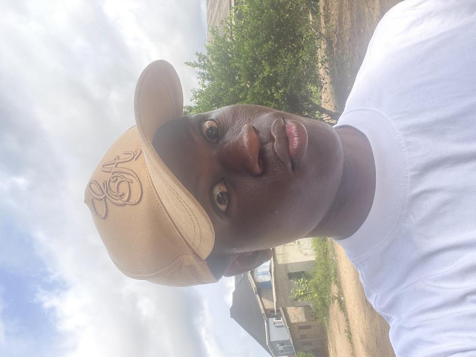 A dark-skinned person wearing a beige baseball cap and a white t-shirt faces the camera at an upward angle